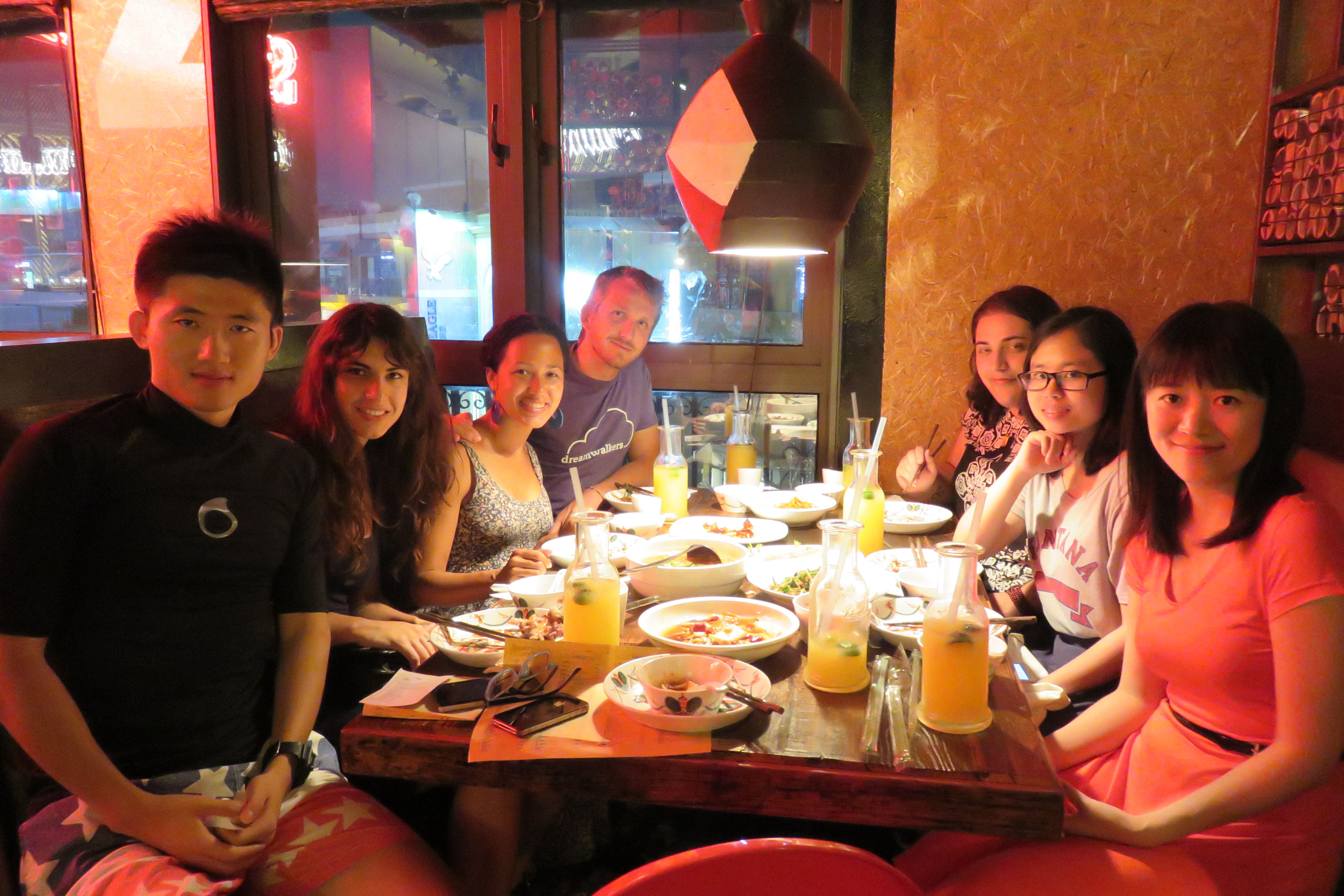After checking out the collection of hilariously shaped ancient Chinese coins, we headed to our couch surfing host Bruce. He is a very outgoing guy and does anything to help you. He shared his apartment with two roommates Maria (from Argentina) and Menka (from Canada). After a quick shower, we went for dinner to a little restaurant nearby and had our first Chinese meal. After 2 weeks in Mongolia, dirt with pepper in it would have tasted full of flavour, so we may be biased when we said it was: AMAZING! Tasty, very quick and super cheap (like everywhere in China). After dinner we went out and Bruce got us on the entry list for a pretty upmarket club. Full of models (David didn’t notice, Tamar had to tell David, otherwise he wouldn’t have been able to see them), tables of Chinese people drinking high class whiskey and a mix of trendy Chinese and foreigners (expats is a bit of a dated term, don’t you think?). Pretty good fun 🙂