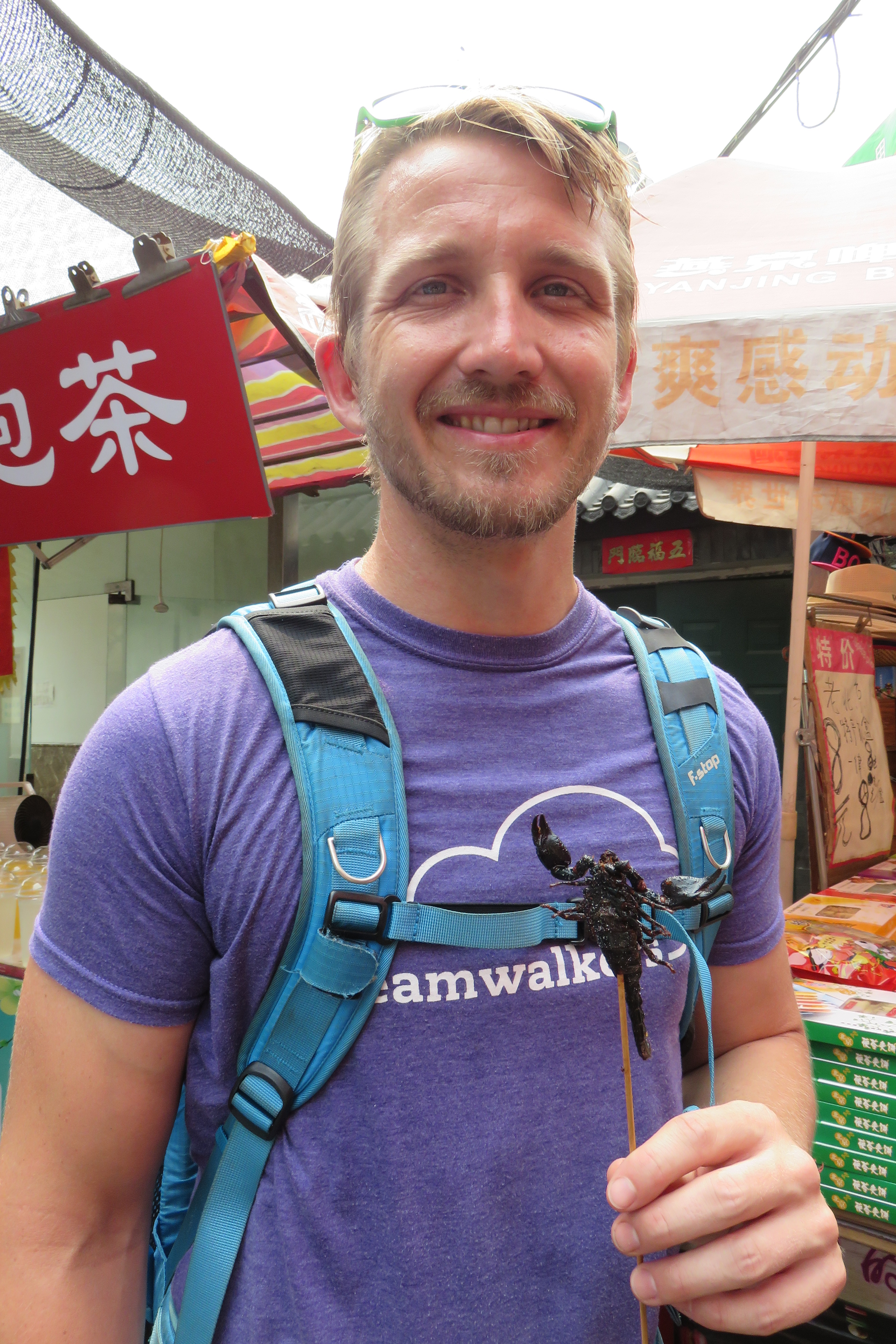 In any case, we finished wandering and found the Wangfujing Night Market, which offers a huge variety of exotic snacks, David fulfilling a life long wish to eat a scorpion. Crunchy (no, it doesn’t taste like chicken) and spicy, not too bad at all.