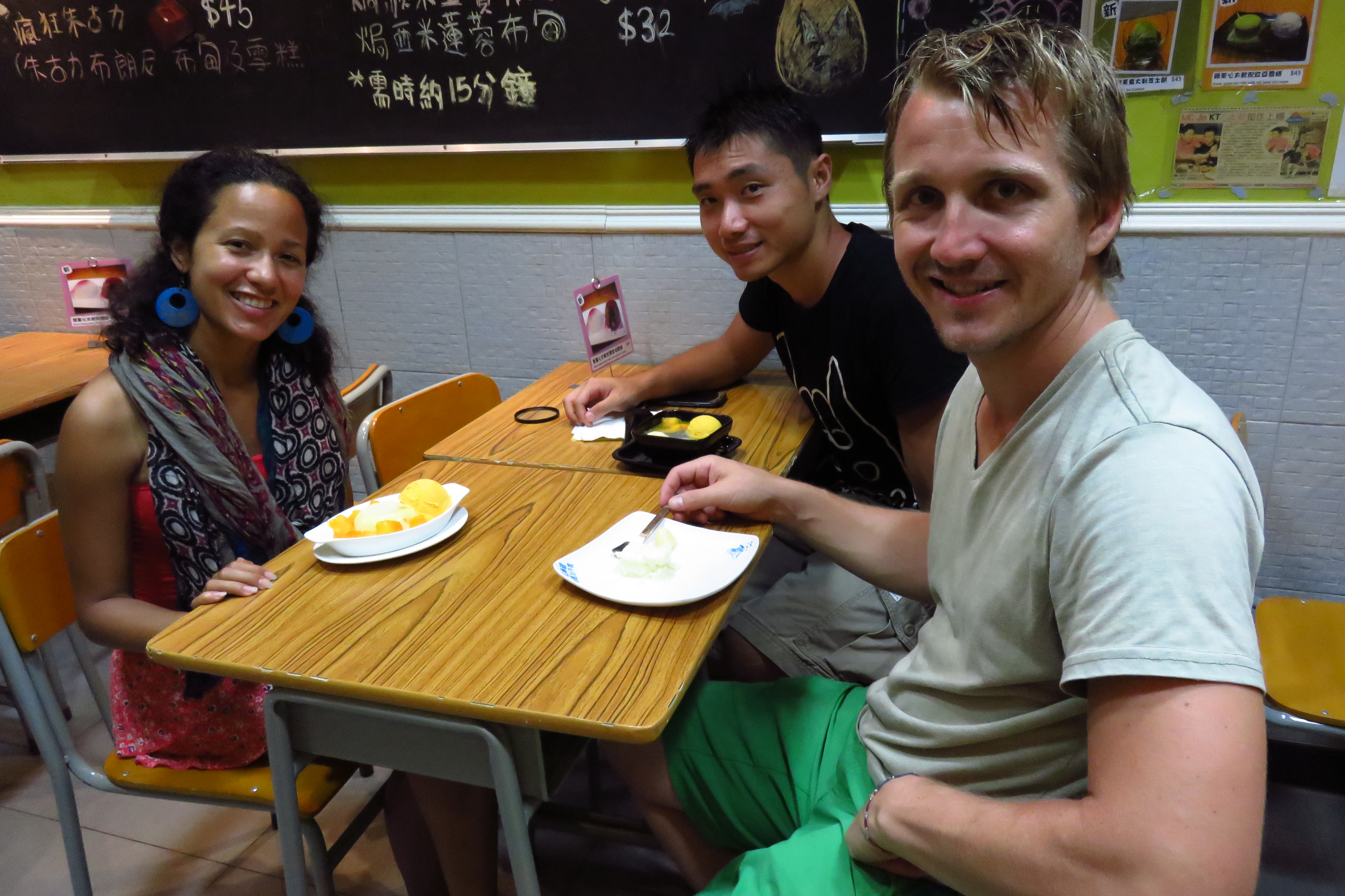 The rest of the day we discovered HK by foot, metro and ferry and met up with Ken at the Symphony of Lights. It is big light show between the (close) islands, but it didn’t show its full beauty because of clouds and rain and very annoying accompanying music. We went out for dinner and Ken brought us to a nice please for a yummy dessert (durian fruit ice flakes for David).