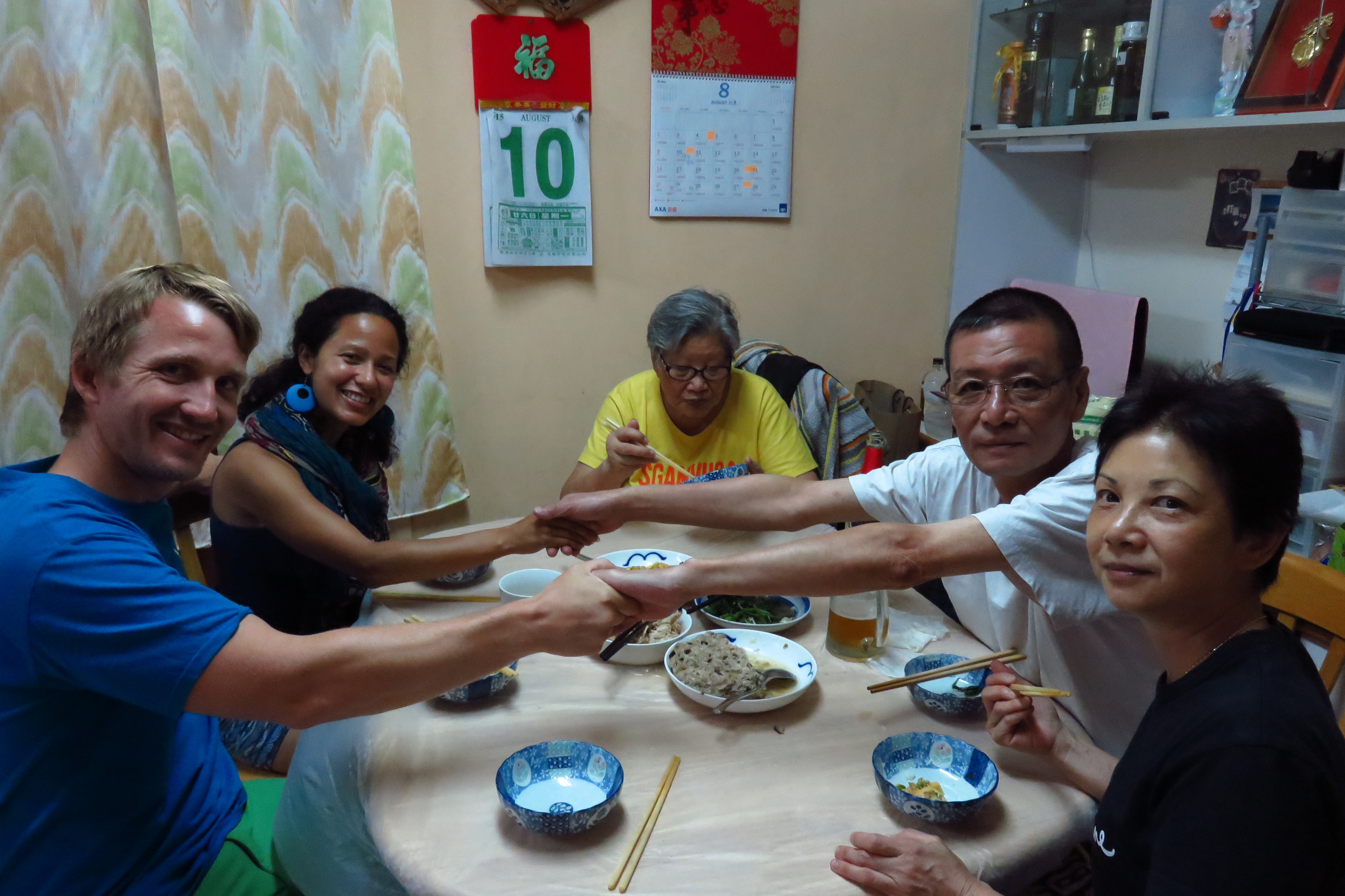 Unfortunately the next day it kept raining. Ever since we have been travelling we have rain at least one day in every city we stay at. We are getting hunted, lol. So we had a delicious breakfast at the local dimsum restaurant in Aberdeen (The restaurant is always packed in the morning with people over 65 years old) and went to the library afterwards to arrange some things online (email, whatsapp, hostels and couchsurf places etc). We were by the way so happy to have full access to Facebook, google and gmail again in HK. When you can’t go to these sites, you find out how much you normally use them. Anyway, we did our thing in the library and went afterwards into the city centre to buy a new e-reader for David (as he had broken his old one by accident). And we went to a park called Tamar Park (incl a Tamar cafe, amphitheater etc.). We met Ken at 7 pm at home to go to his grandmother for dinner. We had a lovely dinner with her and his uncle and aunt.