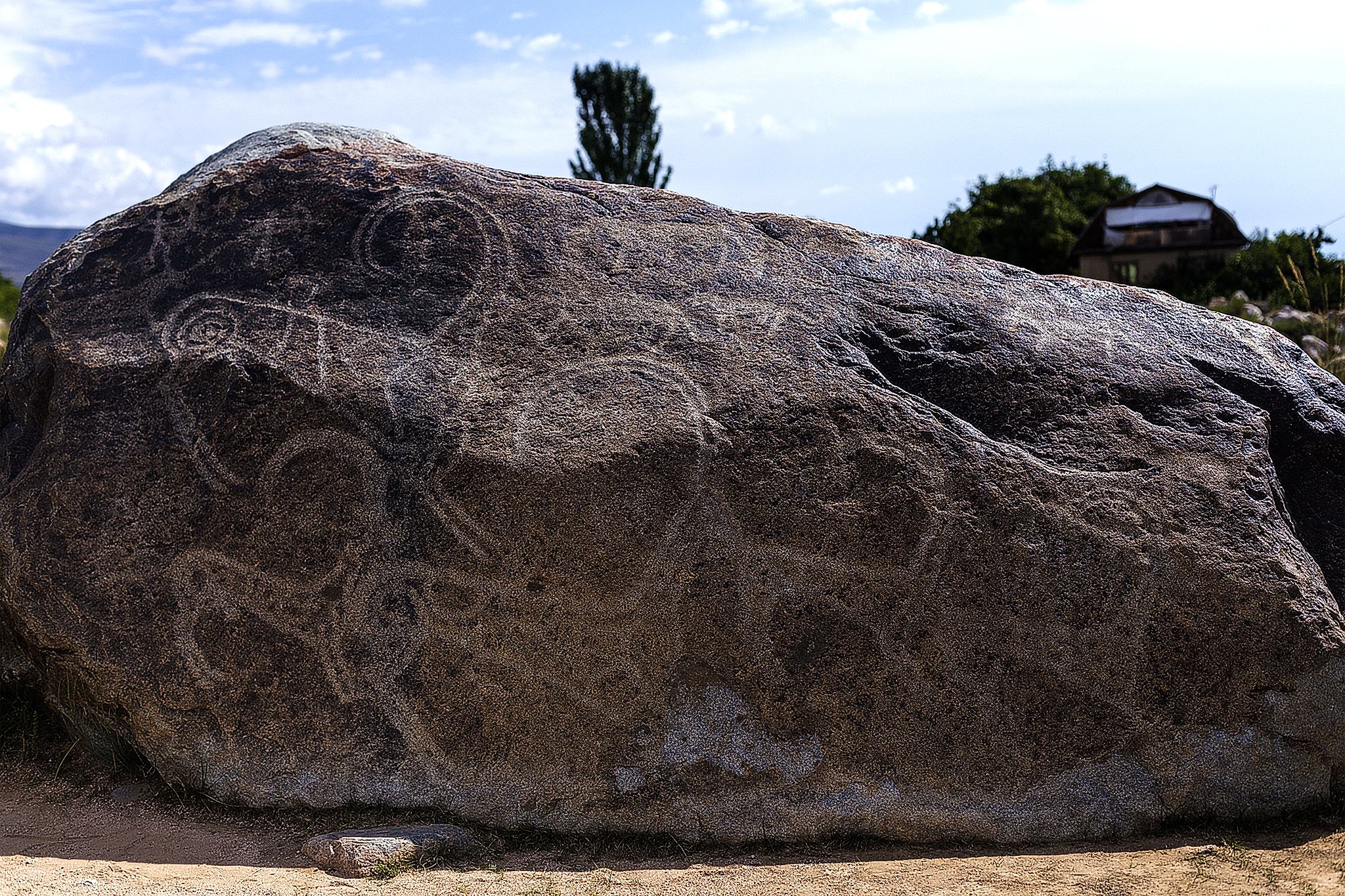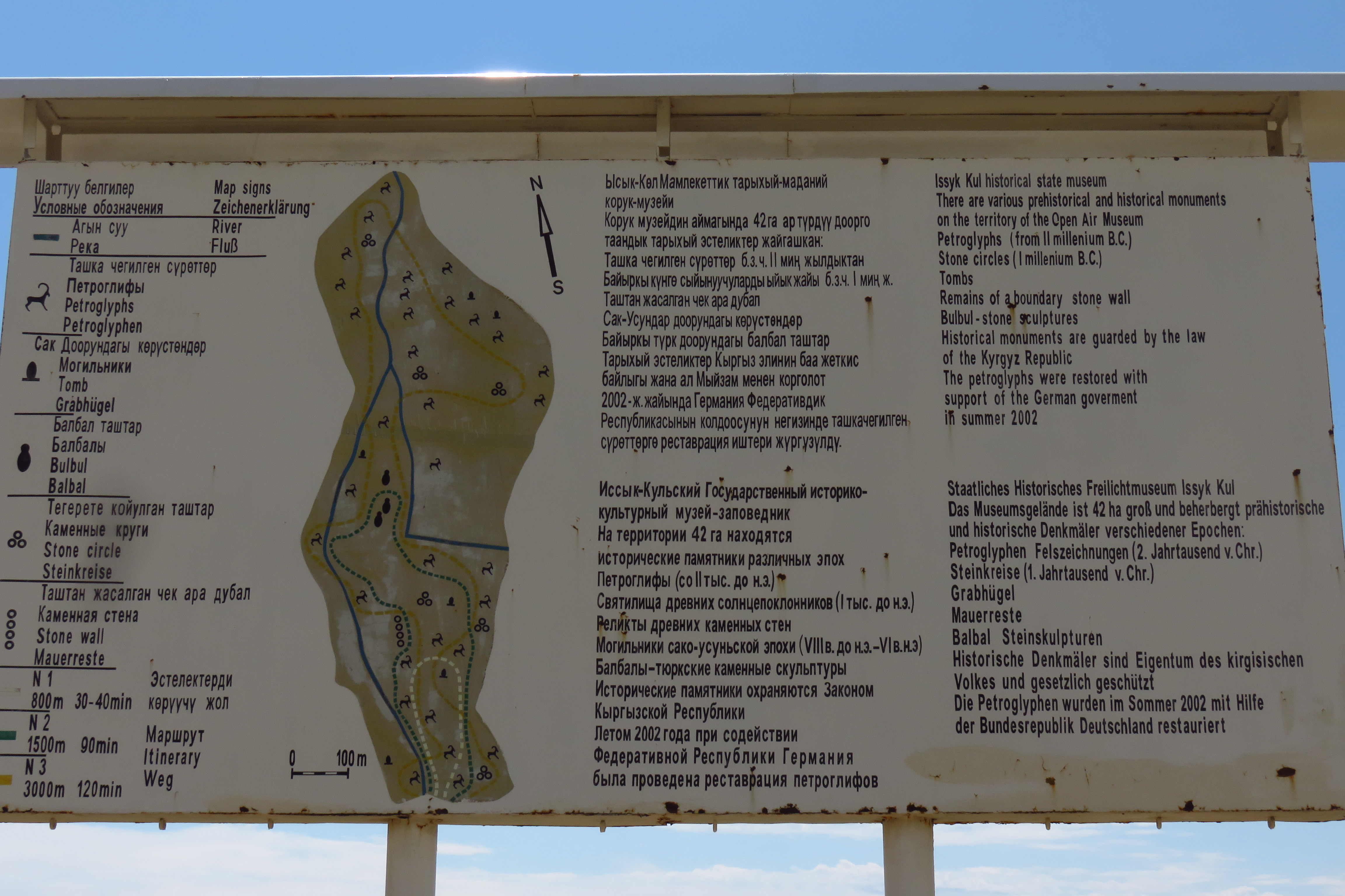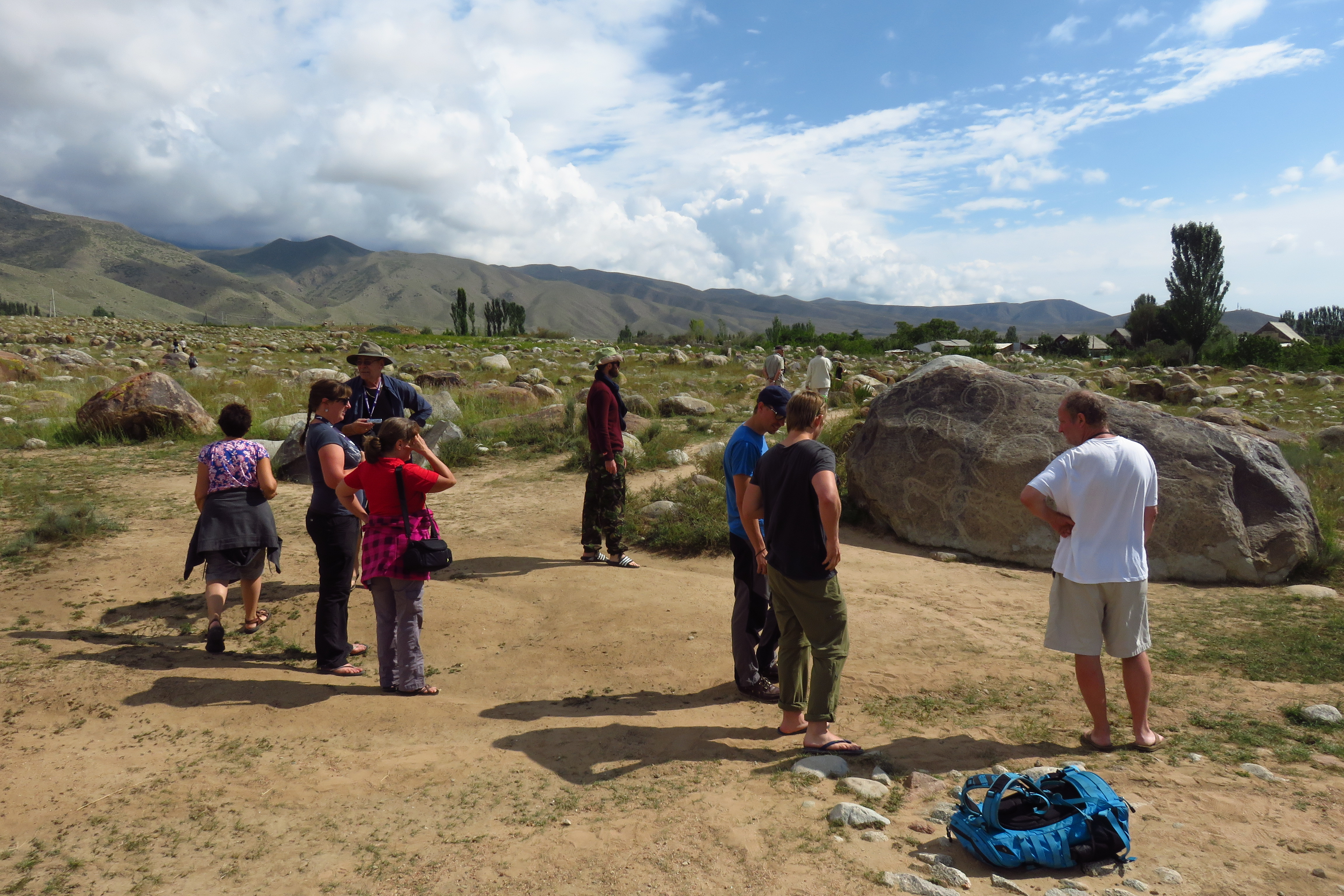 The next day, before we left the lake, David jumped in the lake early for a wake up while Tamar was on cook group duty (and she found it way to cold to swim anyway) and after our breakfast we went to visit some petroglyphs. They were carved into the rocks by the first people of Kyrgyzstan thousands of years ago. Many Ibex pictures, quite interesting and even one scene of people using tamed snow leopards to hunt ibex (you’ll need to use your imagination to see it in these pictures though 😉 )