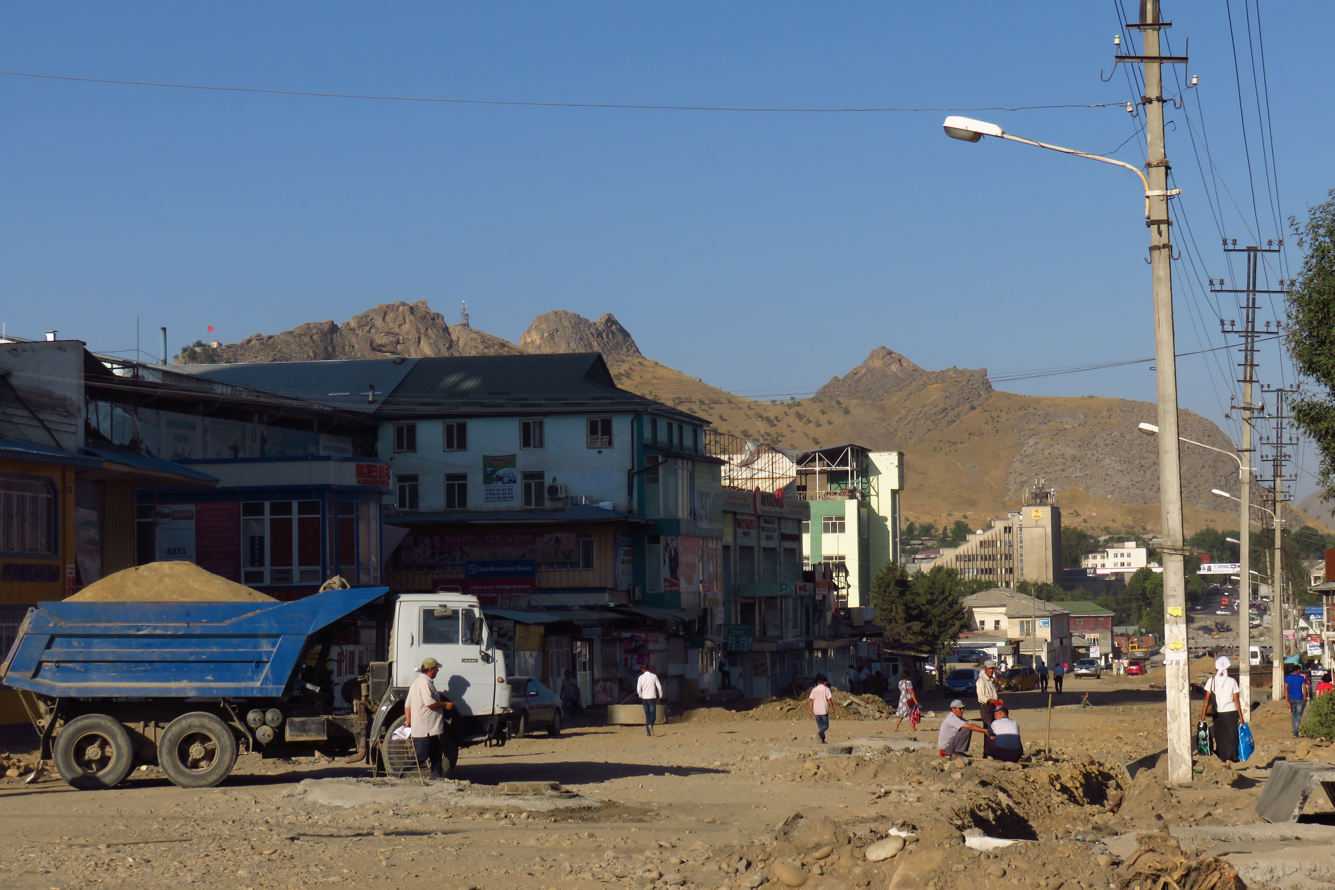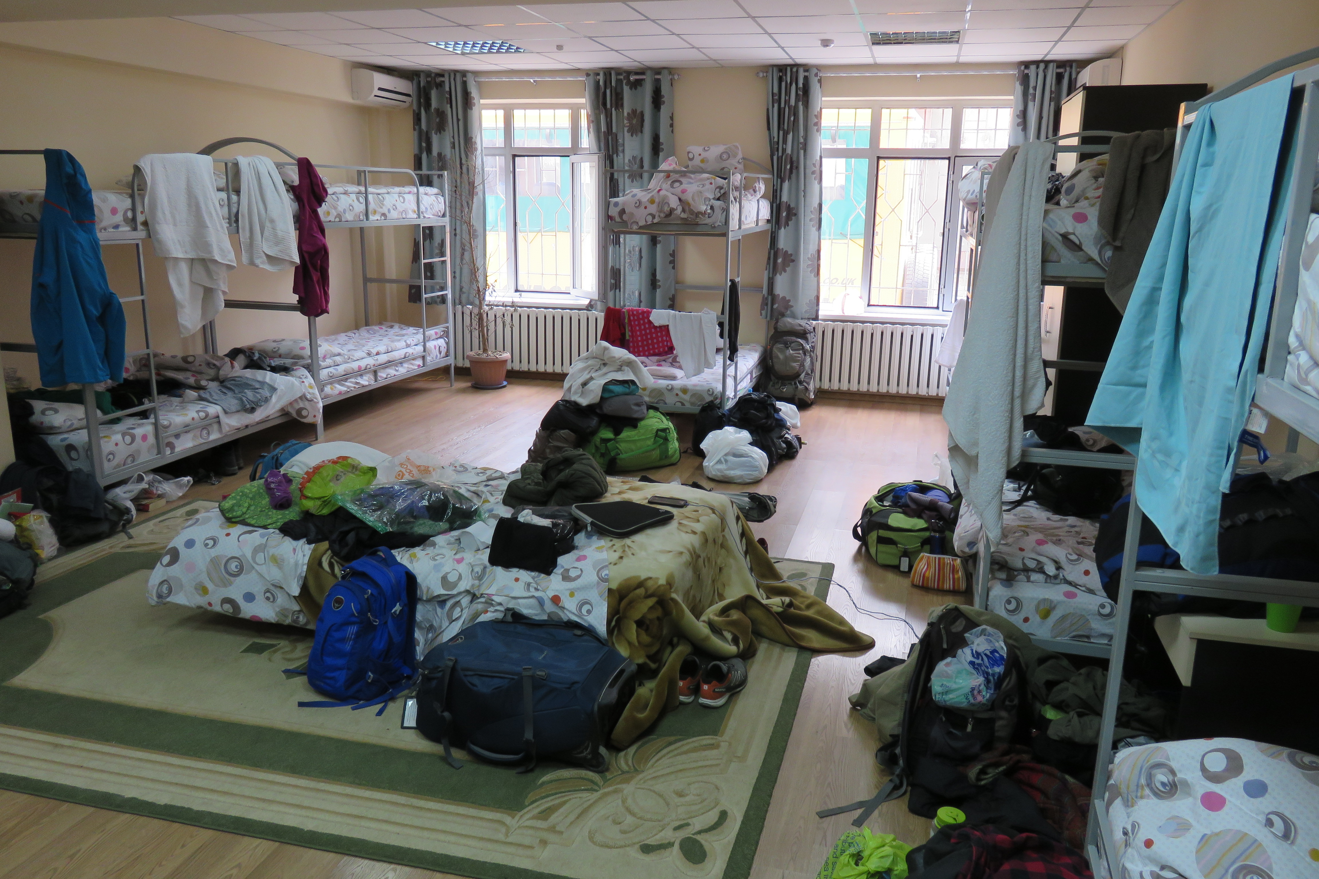 The only thing we didn’t expect was to arrive in the middle of the night at 01:15 in Osh, in a parking lot, in the middle of nowhere… We didn’t have any som (local currency), we didn’t have a hotel for the night and we didn’t have a map of Kyrgyzstan downloaded on David’s phone… We found a taxi (a car even smaller than our Toyota Aygo) and after some haggling (and luggage Tetris) we drove with another passenger to the hostel that we had booked for the next night. But the hostel was full… So, no other option than to wait for dawn. Luckily, the hostel had an Internet connection ;-). Happily, after an hour of waiting some people checked out and the hotel manager let us sleep in their beds. Sheer luxury!