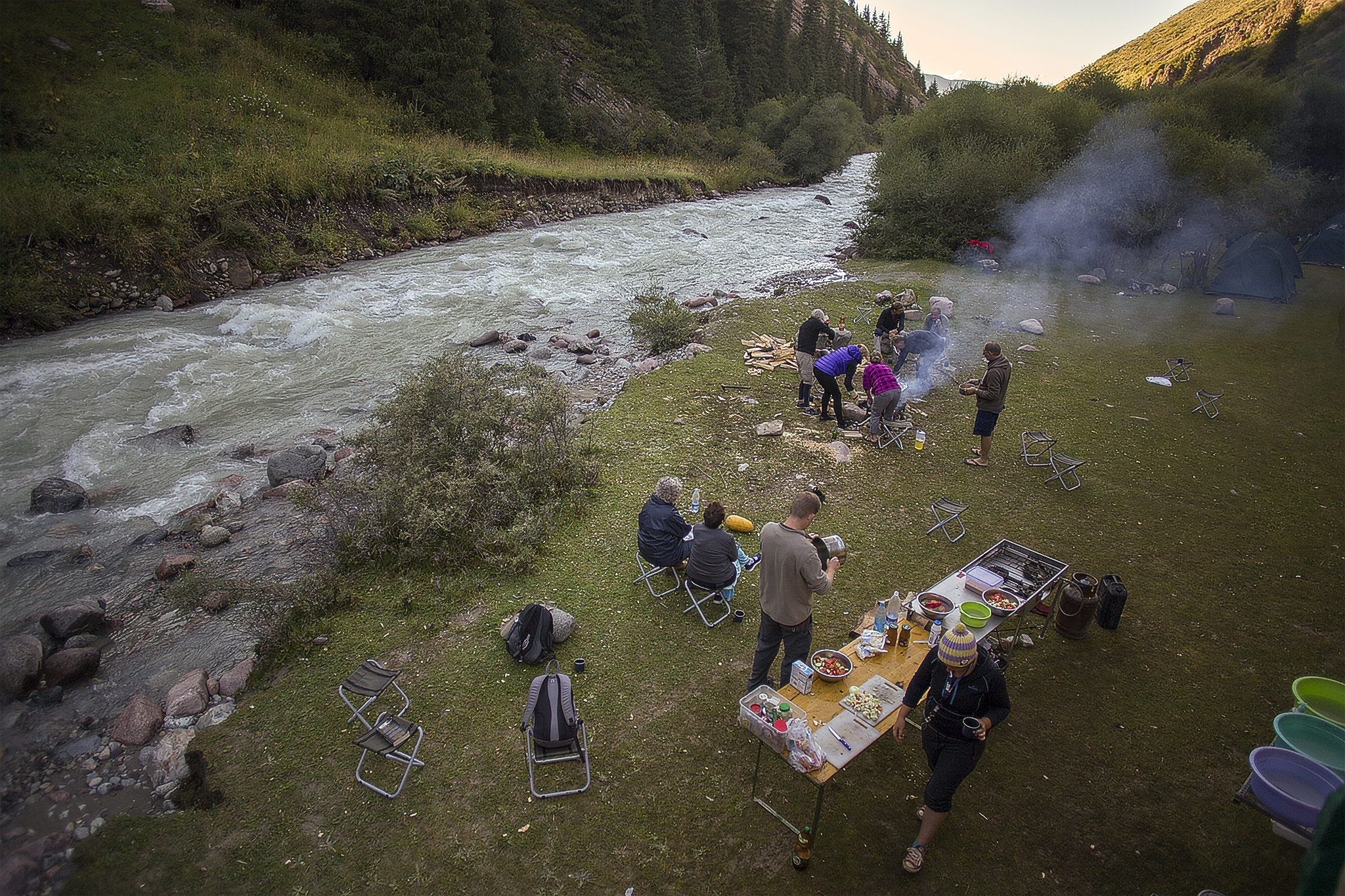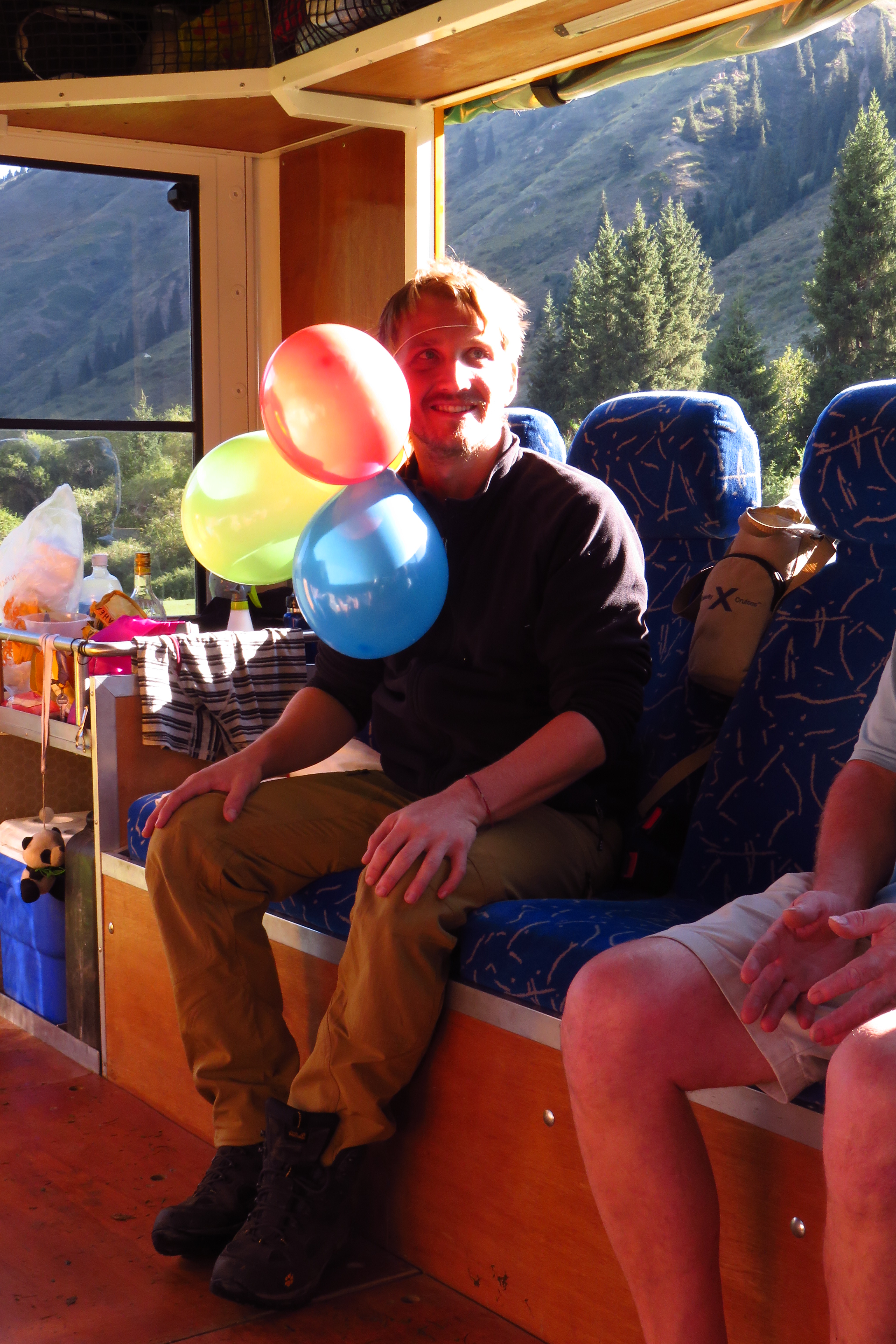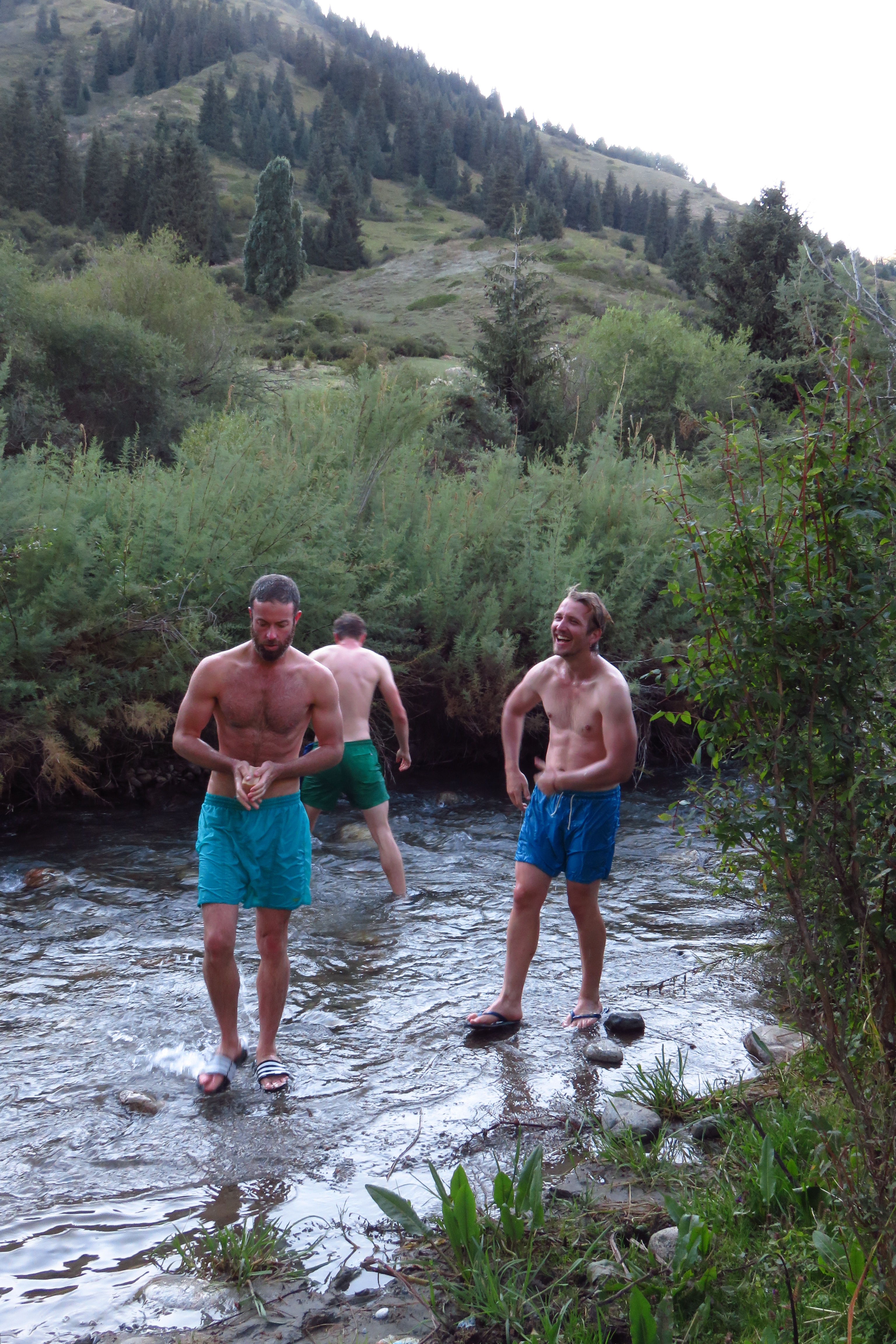 The truck lunch in the sun, close to the lake, was a welcome relief from the grey clouds. We jumped in the lake with couple of the others from the tour and had a glorious swim (removing our swimming clothes in the lake and enjoying the associated freedom that entailed). We left the lake and spent the rest of the day in the Semenovskre Gorge. David went for a run with Simon and Richard from the group, up the valley, enjoying the nature, while Tamar prepared secretly some things for David’s birthday. The boys returned pretty sweaty from their run, so jumped very quickly into the stream for a wash (David’s third for the day!). Glacial melt water will really give you that special refreshing feel, your skin is so alive you can become convinced that you have gained an extra sense. A camp fire under the stars finished off this awesomely active day with a birthday song at midnight.