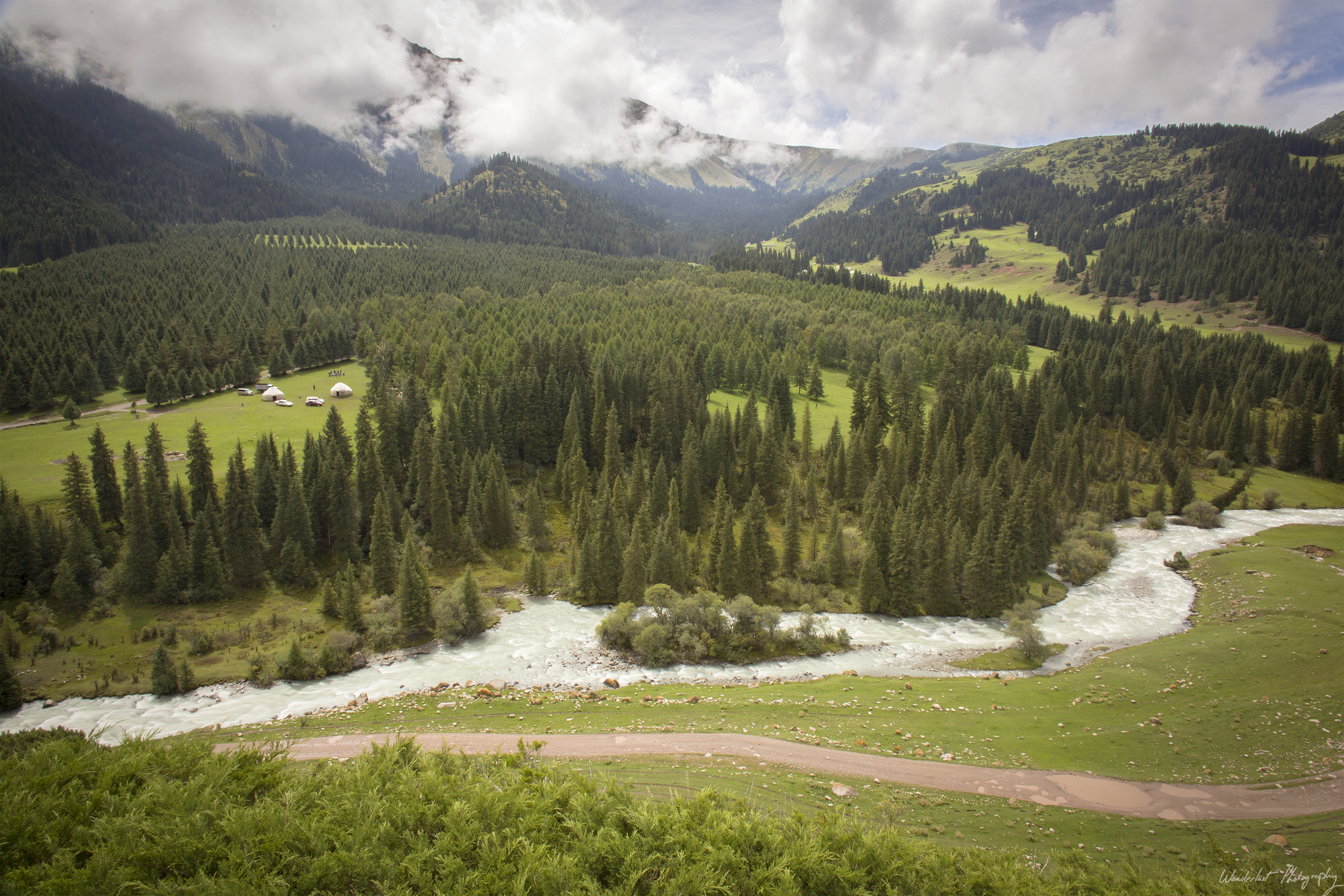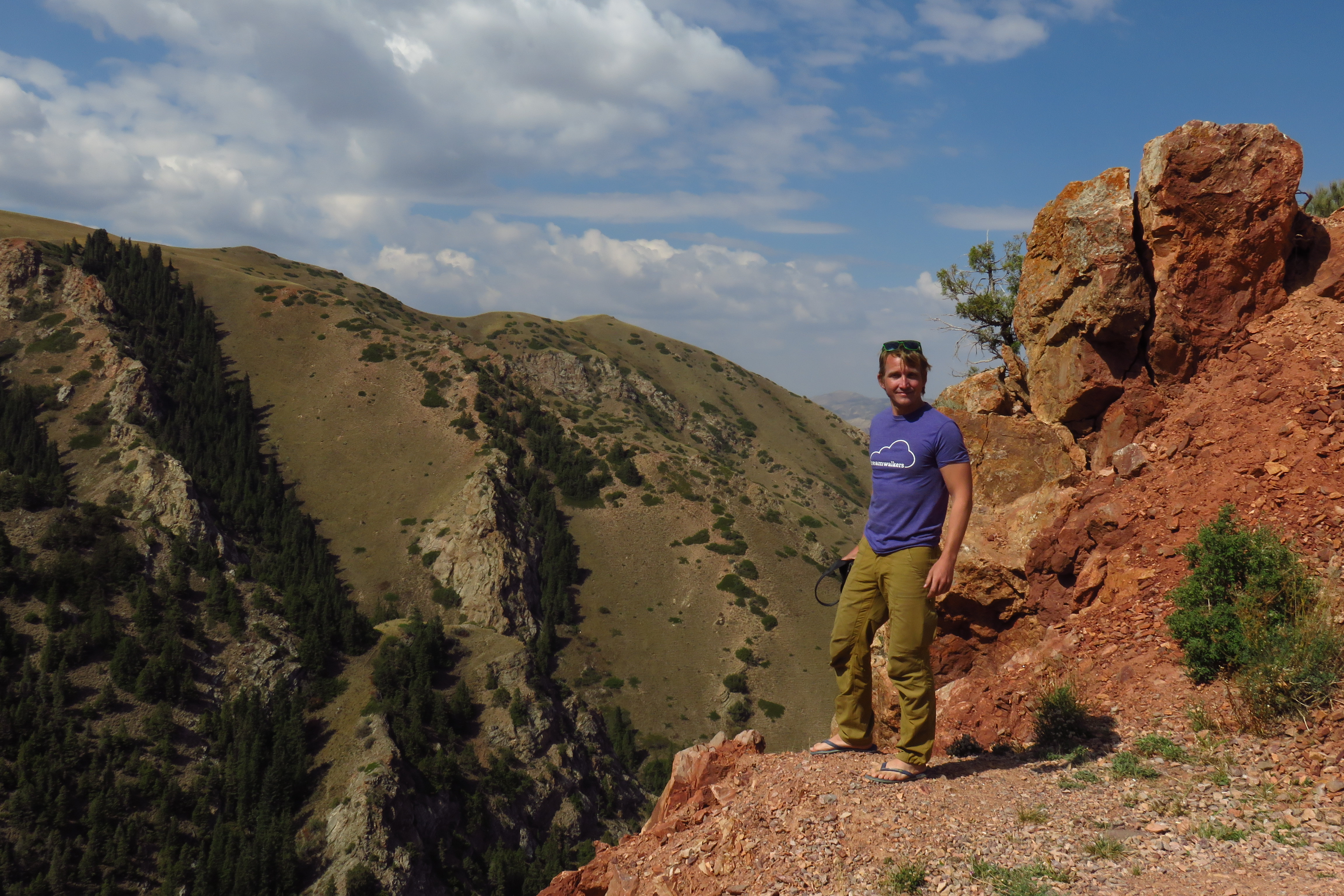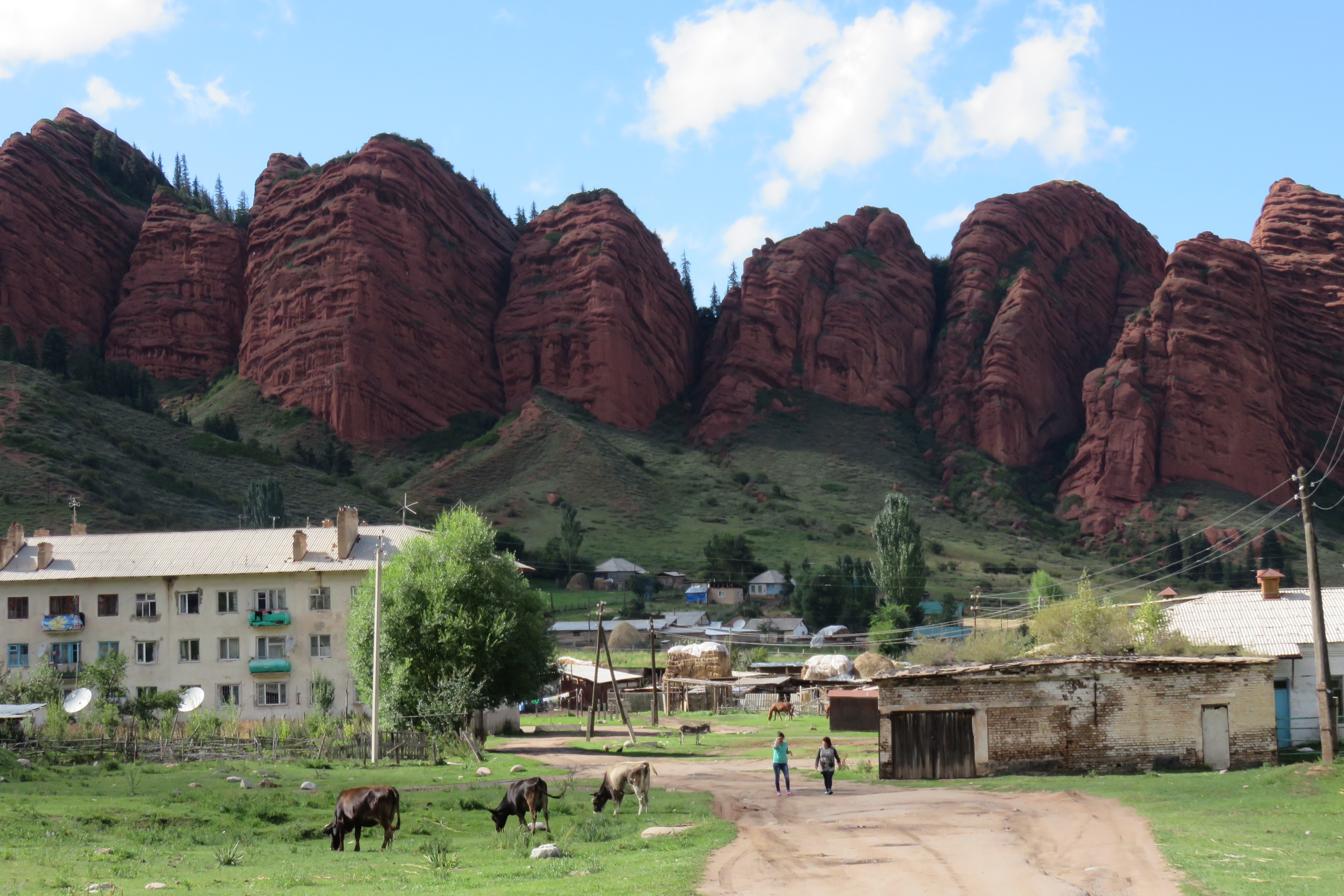 David’s birthday! Pretty happy to be getting older, he has decided that he wants to get older for a really long time. After a food shopping stop at the town of Karakol we drove to an even more beautiful site on this day, camping in the curve of a fast flowing stream along the Terskay Ala-Too Mountains and close to the red stone cliffs in Jeti Orguz. We made a great fire, had a nice time with new friends and one of them (Katie) was also having her birthday, so a extra big party ensued. No photos of the party, but some of the campsite during setup.