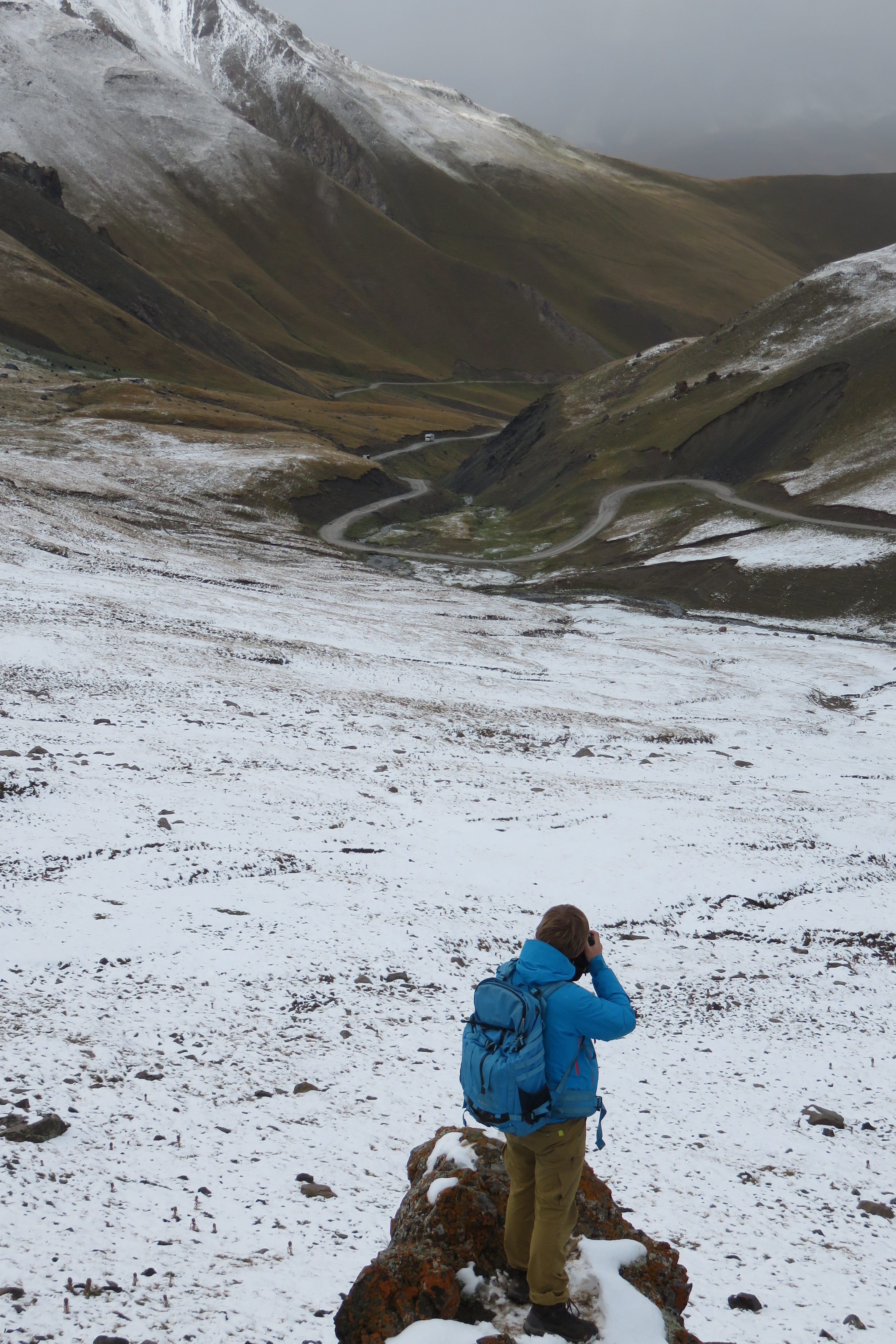 After breakfast we headed off for our two day ger stay, at Sol-Kul lake (pretty high alpine lake, at 3000m. It is big, at 18km wide, but the deepest point is only 13m!). First though, we would need to go over the Kalmak-Ashuu pass, at 3457m high. We heard that it might be snowing, but were still surprised to be caught in a sudden snowstorm as we reached the pass! It passed quickly, leaving us with some great views down to the lake and where we had come. There was so much snow that the group even made a snowman.