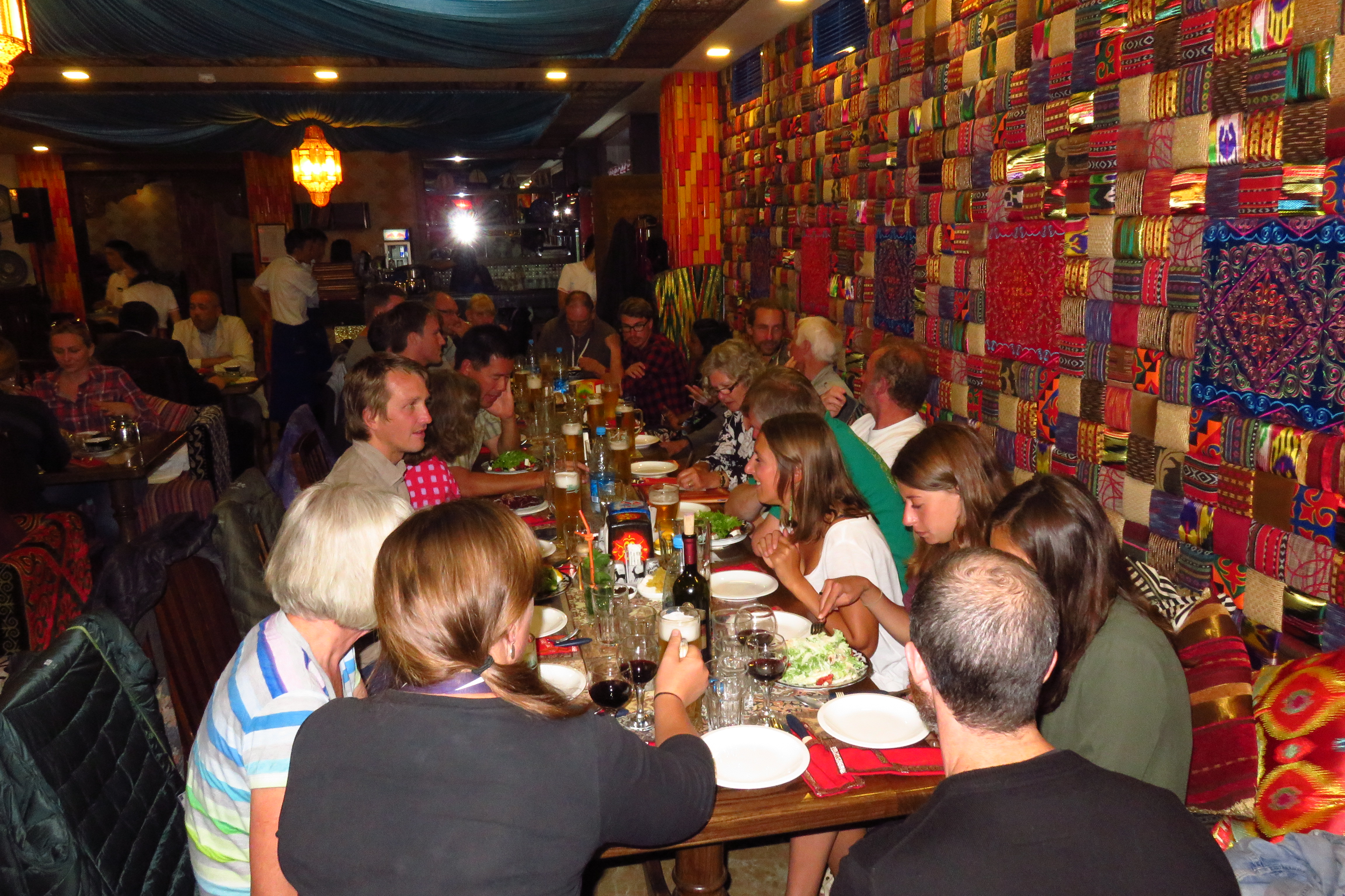 In the late afternoon we arrived in rainy and cold Bishkek. After sorting out our bed in the middle of the 16 dorm bedroom (filled with people from our tour group), we got changed into fancy clothes (so good for Tamar to feel like a women again with high heels and make-up) and walked to the restaurant for a goodbye dinner. Eight people from our group are leaving on Saturday (we will get five new people in return). We had a lovely dinner with some nice drinks and afterwards a smaller bunch of the group (incl. us) went for some more drinks at a bar. The girls had some nice cocktails and the boys drank some meter towers of beer. Everybody happy 😉