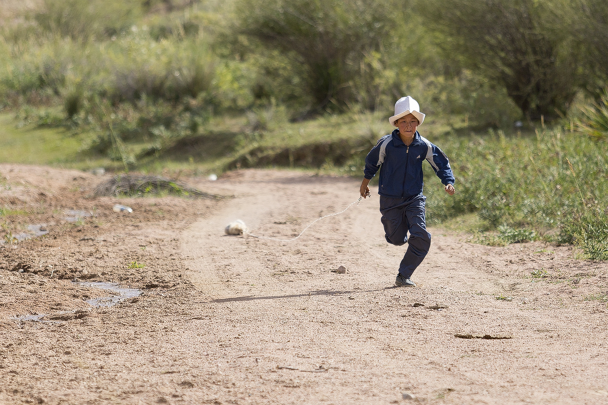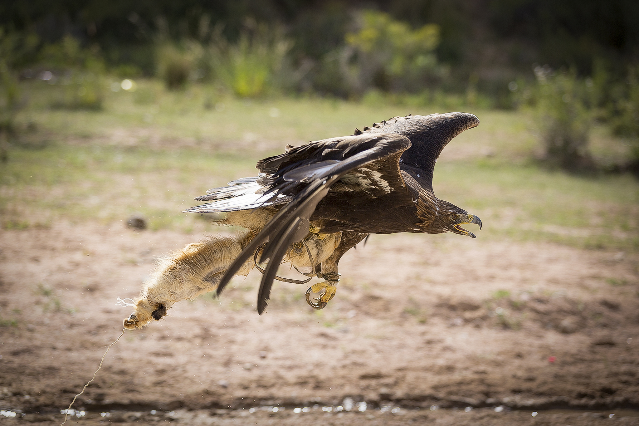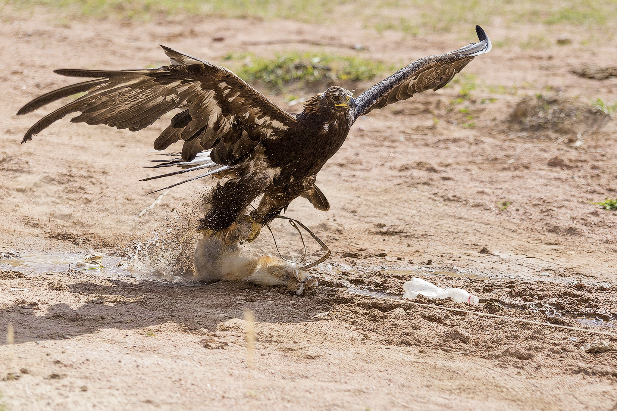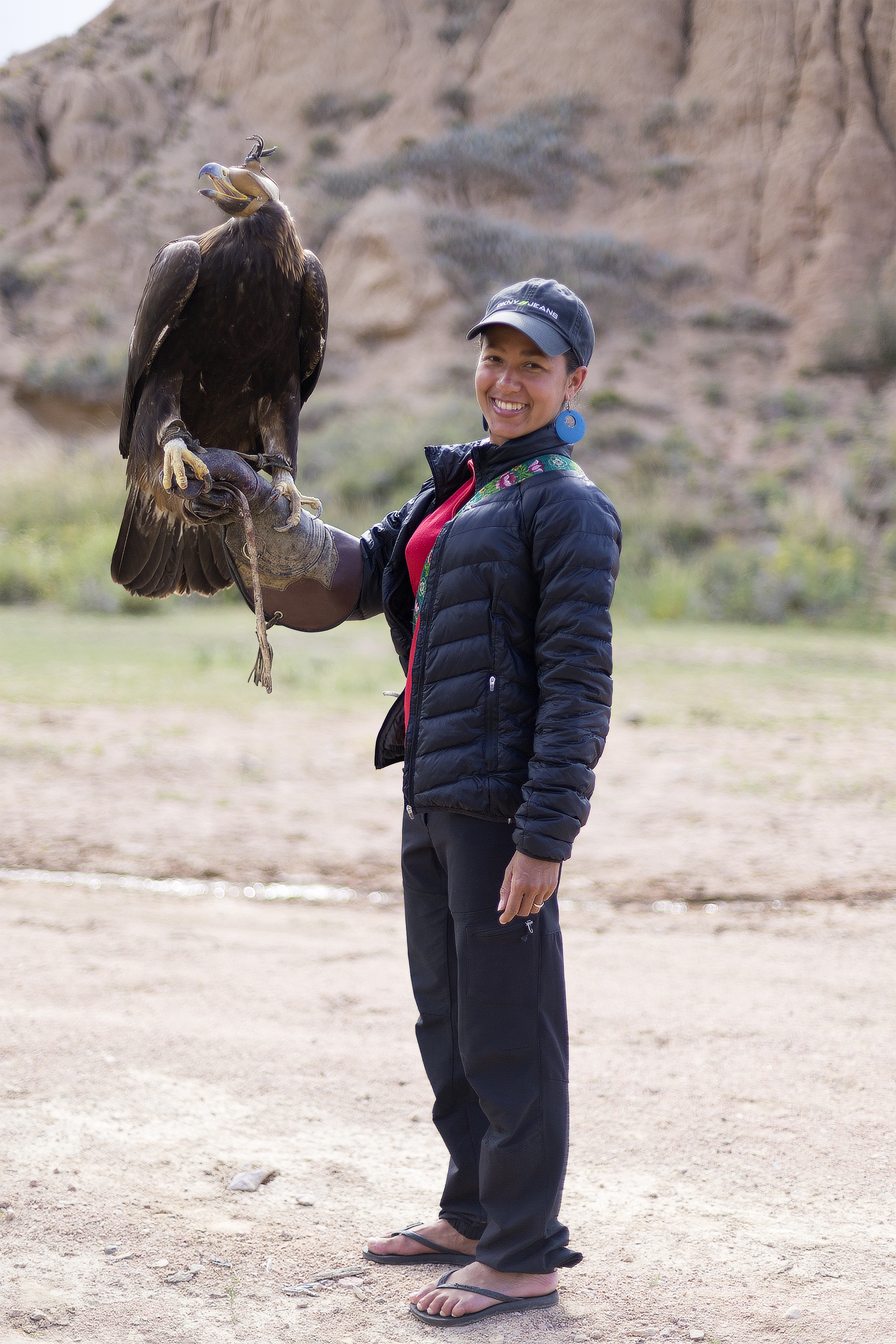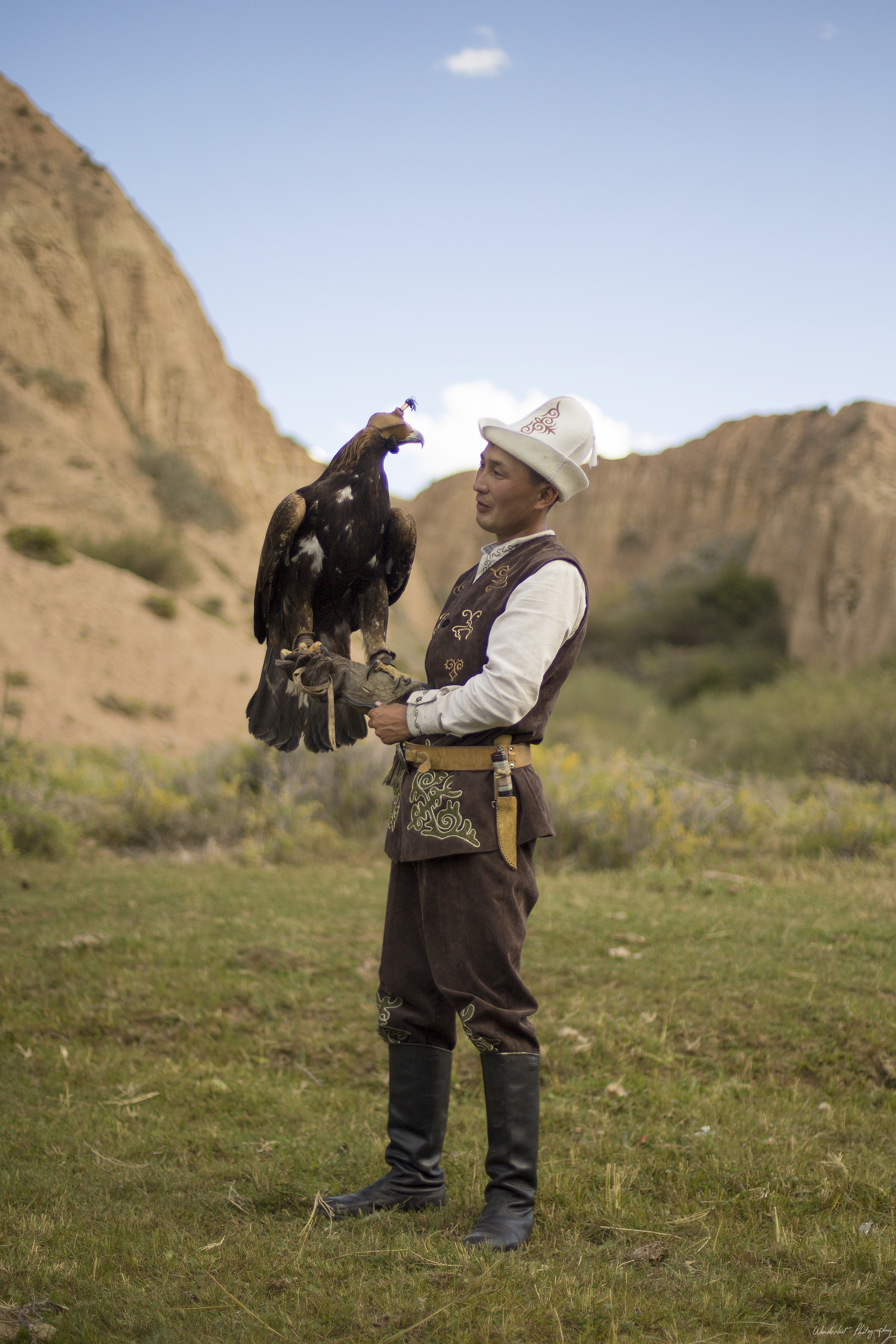 Our main goal of the day was seeing an eagle hunting demonstration. We arrived in mid afternoon, in a beautiful gorge. The eagle hunting guy was dressed in traditional Kyrgyz clothes and we learned a lot from him about the traditions and training of the eagles. The demonstrations. First, his son got a fox skin, tied it to string and started to run. At that moment he released the eagle and it was very impressive seeing it swoop down at speed at grab the moving target.
