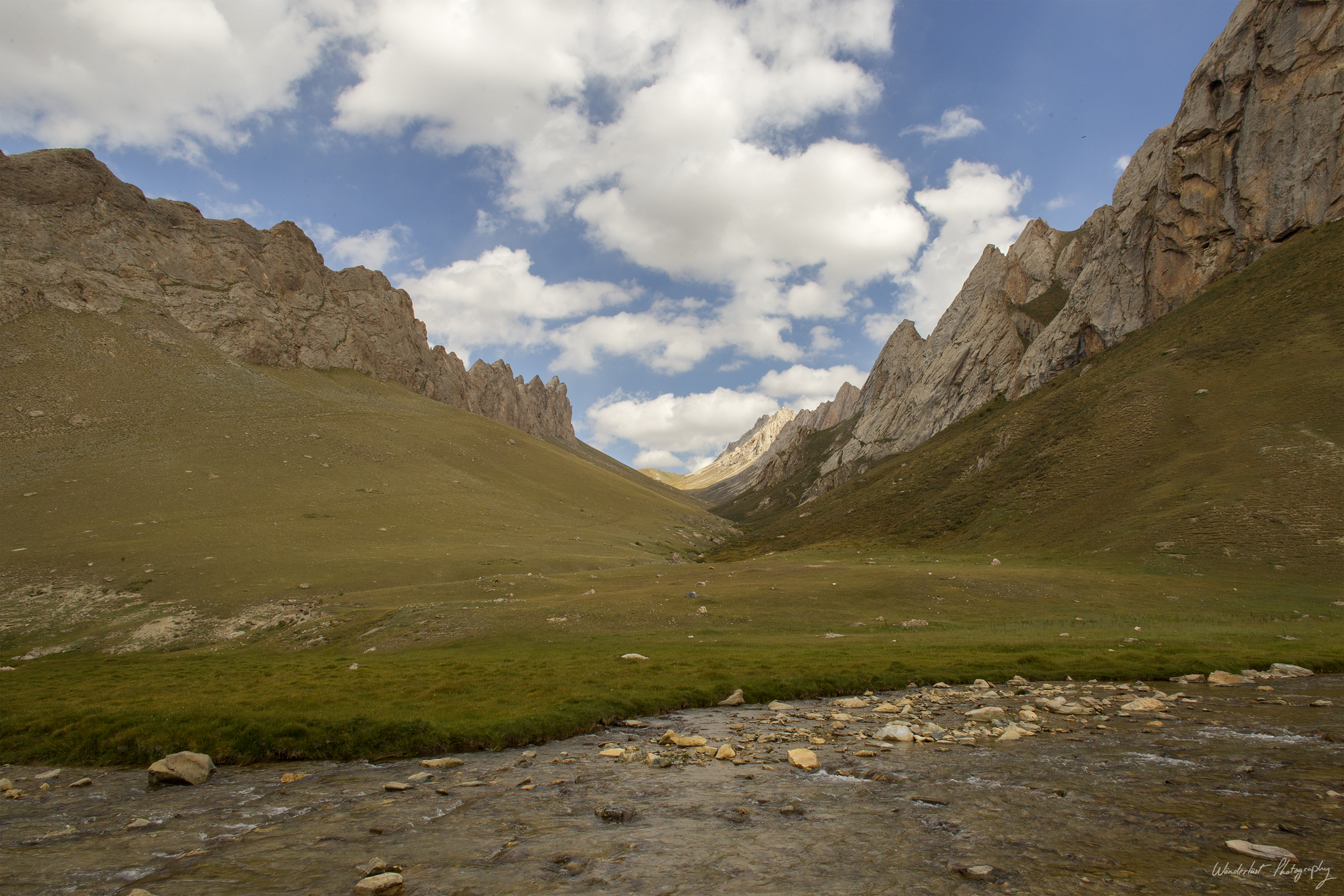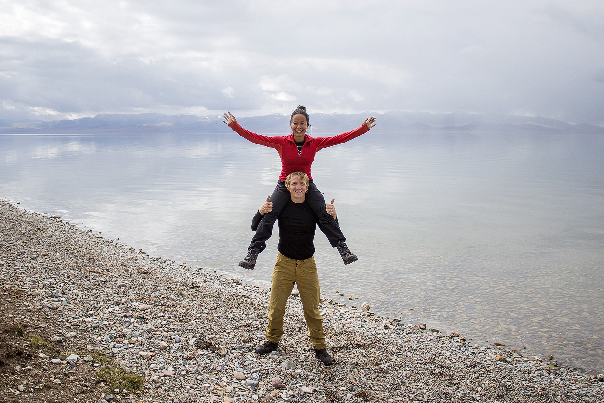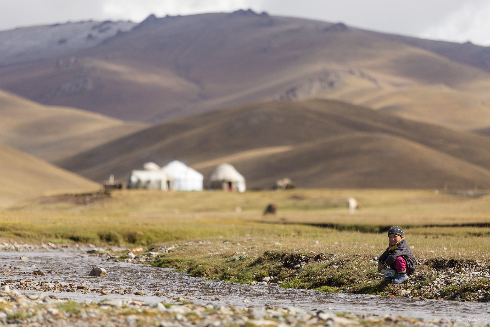 We woke up the next day to see the surrounding hills/mountains dusted with snow, a nice surprise. As we hadn’t been down to the lake yet, we walked down after lunch. On our way to the lake, a little nomad girl walked over to Tamar and took her hand not wanting to let go of it anymore she guided Tamar around. Eventually we crossed the small river and waved the little girl goodby. The water of the lake was crystal clear (and cold, of course) and some lovely views with the clouds over the water.